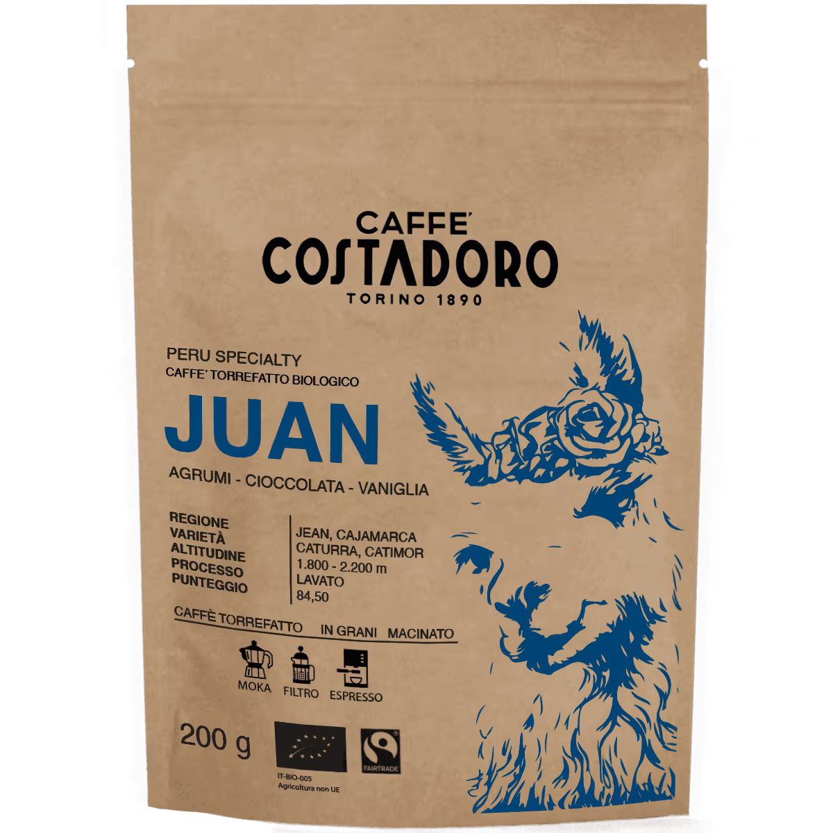 Perù Juan è uno Specialty Coffee* Costadoro torrefatto biologico, proveniente dalla regione di Jean, Cajamarca. Nelle estrazioni in moka regala un gusto con note di agrumi, cioccolata e vaniglia.Si tratta di un caffè arabica di ottima qualità, selezionato da una piccola cooperativa situata nella regione di Cajamarca, in collaborazione con l’Ecuador.La provincia di Cajamarca è stata a lungo la spina dorsale dell’economia della regione grazie alla sua vasta ricchezza mineraria.